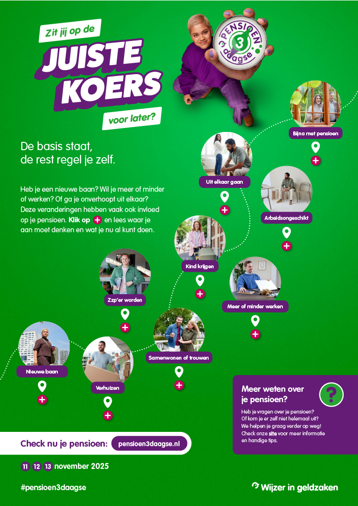 Wijzer in geldzaken organiseert deze 3 dagen. Gebruik de handige tool Check het nu om te bepalen of je op de juiste koers zit. Weet je bijvoorbeeld dat veranderingen in jouw privé- of werksituatie invloed kunnen hebben op jouw pensioen?
